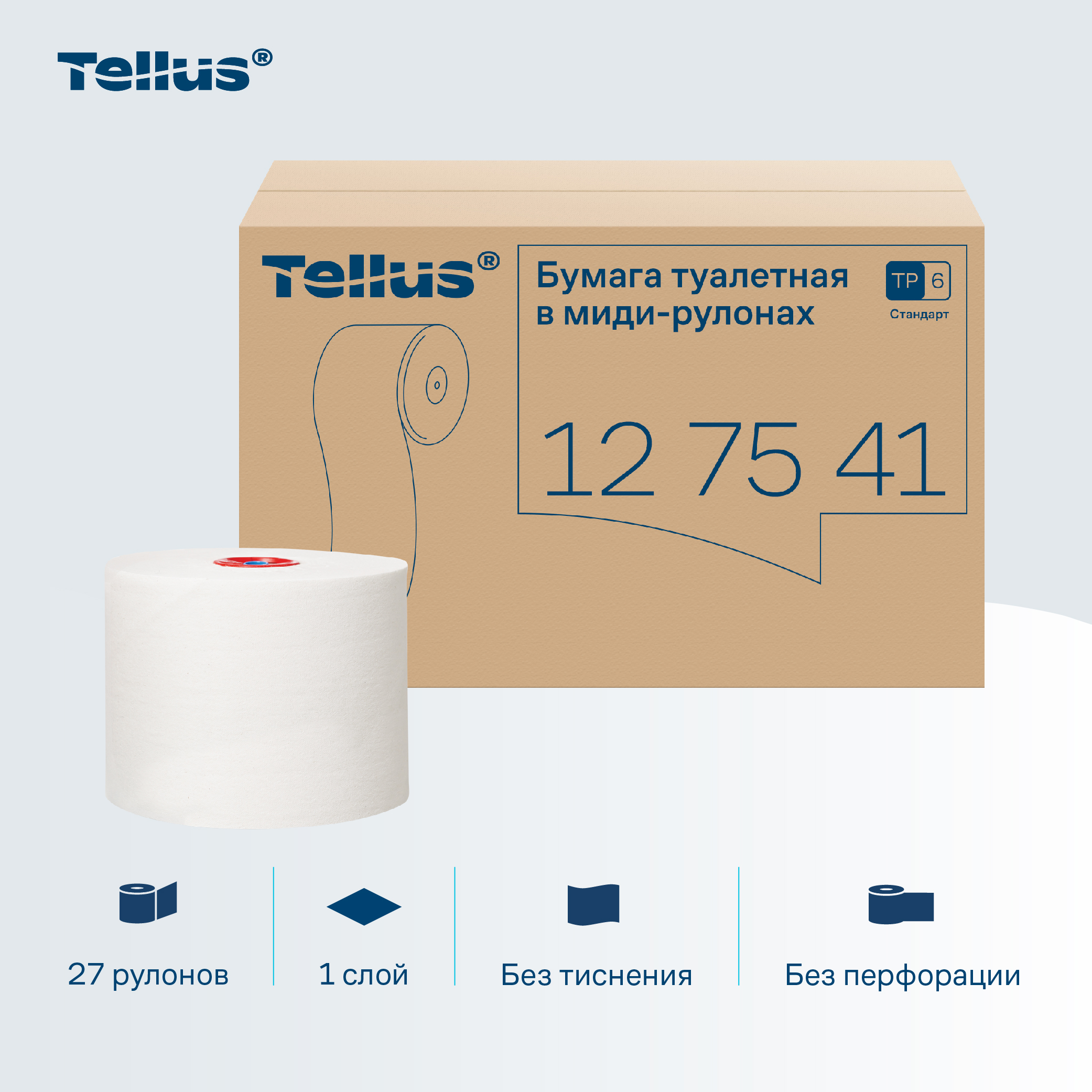 Tellus однослойная туалетная бумага в миди-рулонах подходит для использования в диспенсерах Tork* системы T6, устанавливаемых в туалетных комнатах со средней и высокой проходимостью. Система имеет автоматическую смену рулона, которая в сочетании с большой длиной рулона обеспечивает экономию на обслуживании.