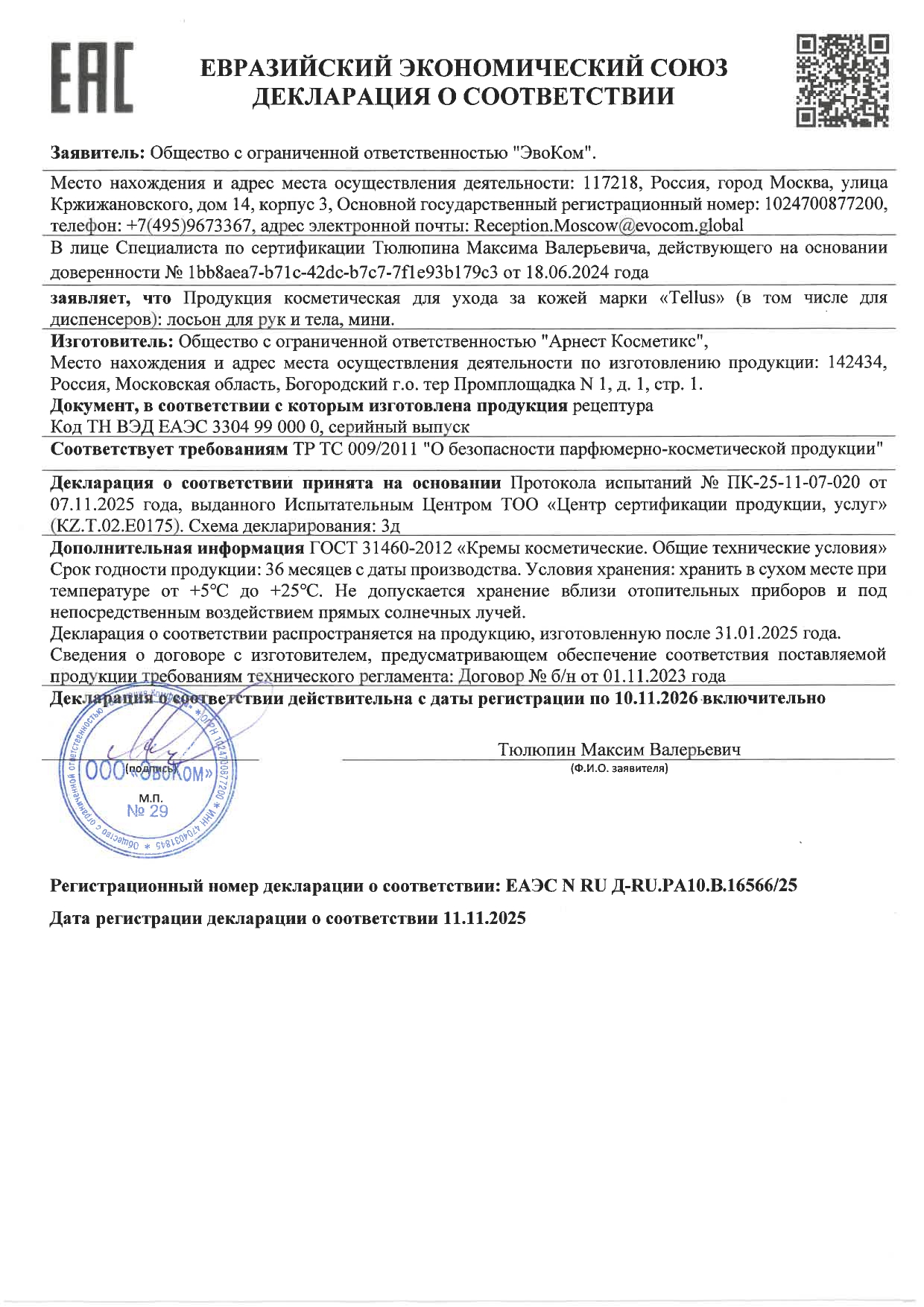 Лосьон для рук и тела Tellus способствует поддержанию оптимального уровня влажности кожи, защищая её от чрезмерной сухости. Он содержит ряд экстрактов, витамин Е, которые стимулируют обновление и восстановление кожи, питают и смягчают её. Продукт не содержит силиконов, парабенов и триклозана. При проведении оценки соответствия Техническому Регламенту Таможенного Союза не тестировался на животных.