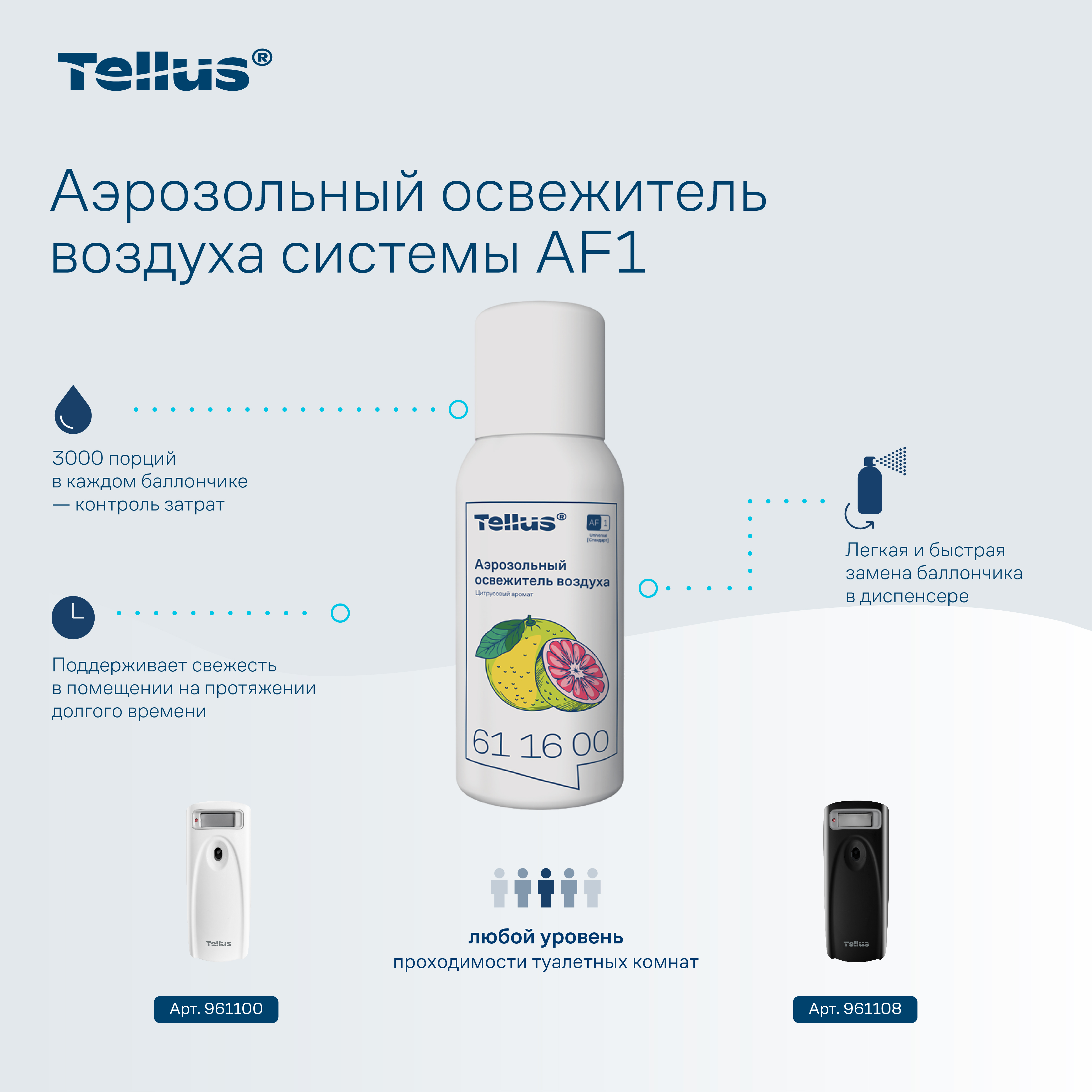 - Благодаря программируемым режимам распыления в диспенсерах Tellus возможно использование в туалетных комнатах разной площади