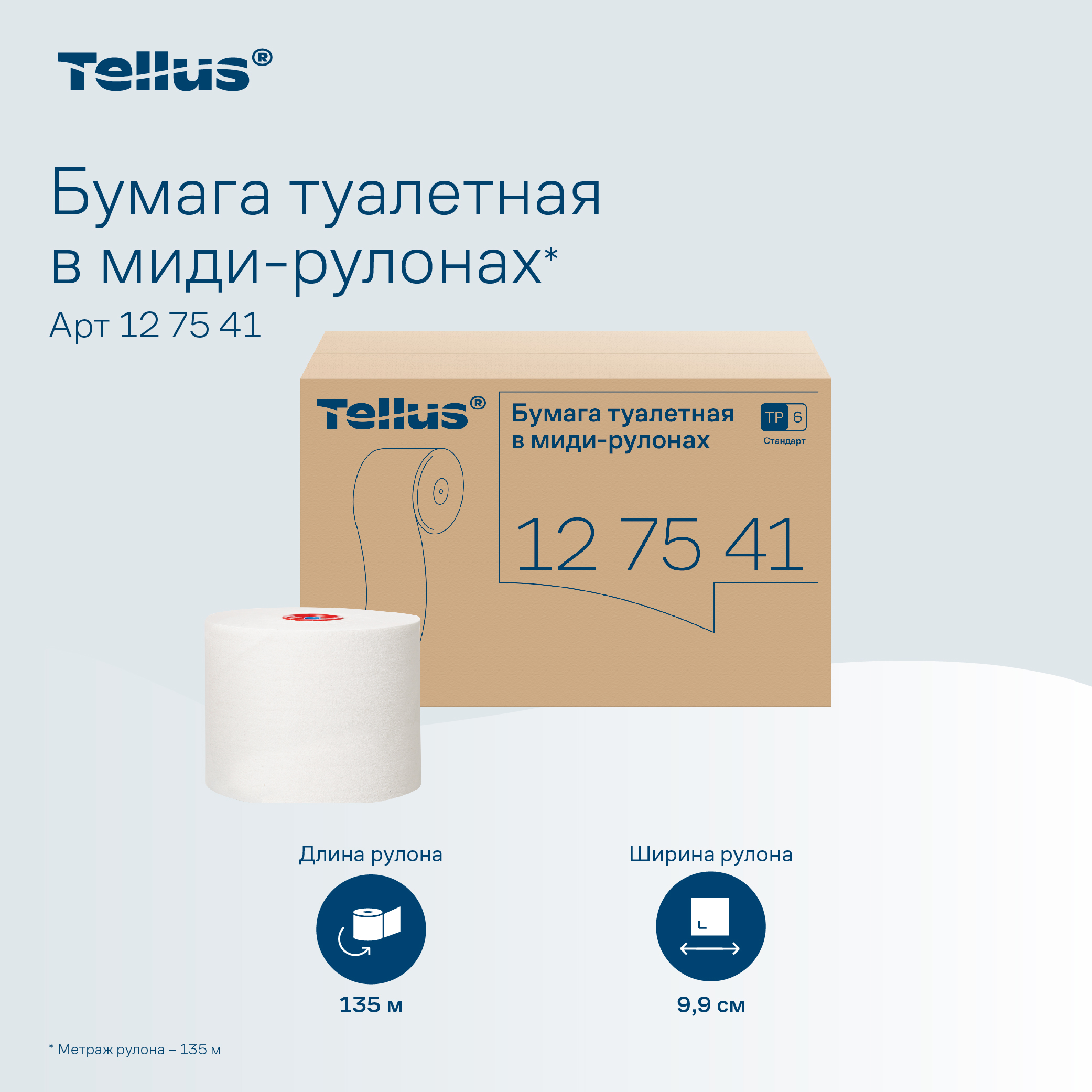 Tellus однослойная туалетная бумага в миди-рулонах подходит для использования в диспенсерах Tork* системы T6, устанавливаемых в туалетных комнатах со средней и высокой проходимостью. Система имеет автоматическую смену рулона, которая в сочетании с большой длиной рулона обеспечивает экономию на обслуживании.