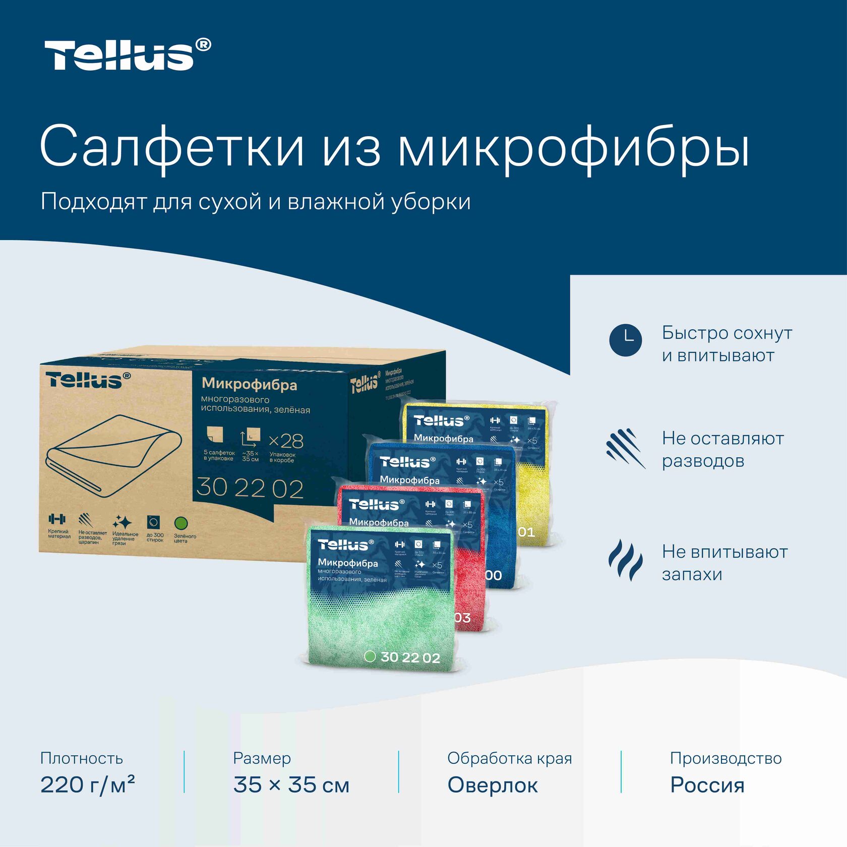 Салфетки Tellus из микрофибры представлены в четырех основных цветах, соответствующих принципам цветовой кодировки в рамках системы безопасности ХАССП: синие (арт. 302200), желтые (арт. 302201), зеленые (арт. 302202), красные (арт. 302203). Благодаря этому салфетки могут использоваться не только для уборки офисов, но и в сферах HoReCa, а также производствах, где необходимо контролировать уборку различных зон и поверхностей и разных типов загрязнений для снижения риска перекрестного контакта. С помощью салфеток Tellus можно очищать такие чувствительные поверхности, как оконные стекла, зеркала, мониторы, оптику, зоны кухни и туалетной комнаты.