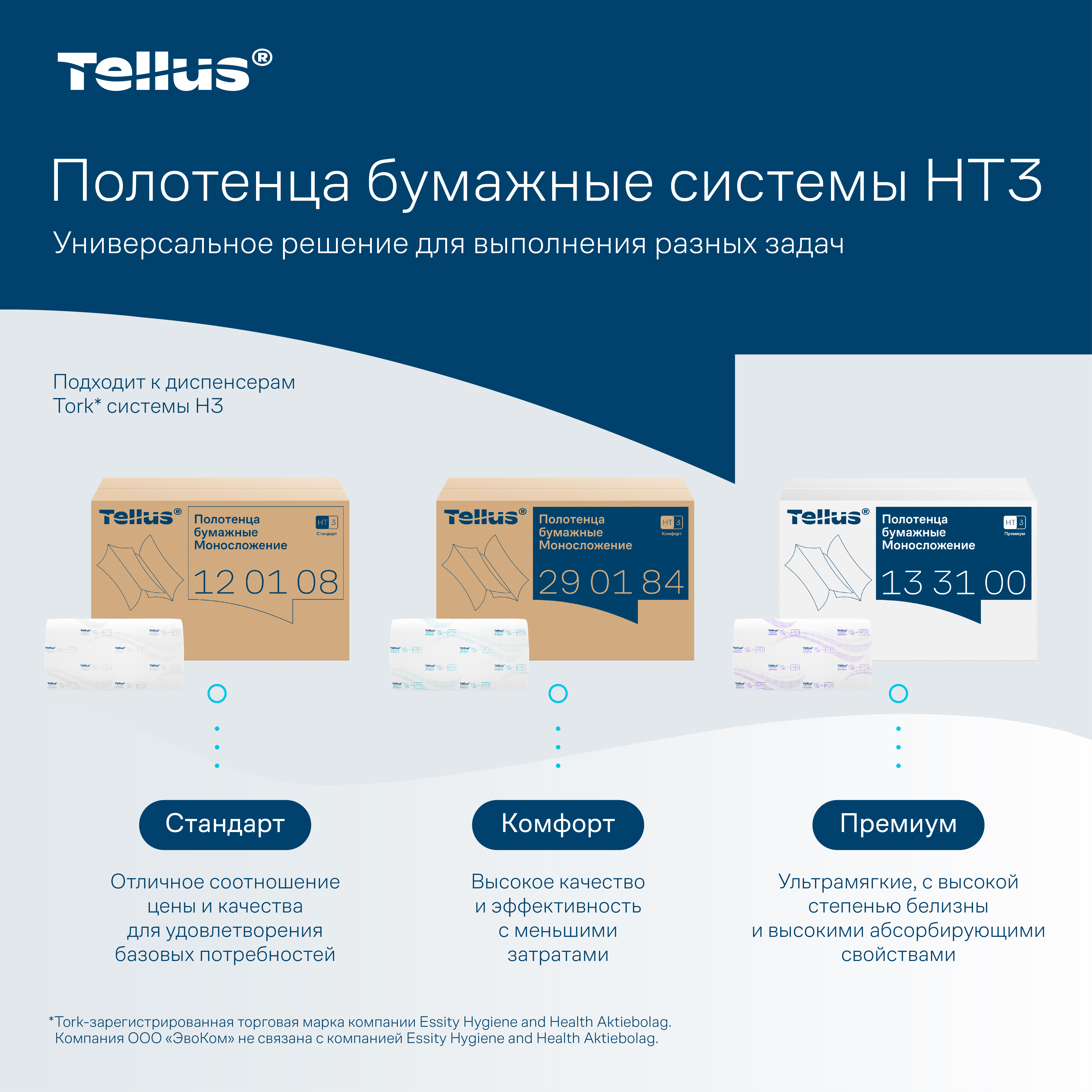 Tellus полотенца бумажные листовые удовлетворяют базовые потребности в высушивании рук и при этом существенно экономят ваши средства. Подходят для использования в диспенсерах Tork* для листовых полотенец. Диспенсеры позволяют контролировать расход и повышать уровень гигиены благодаря функции полистового отбора.